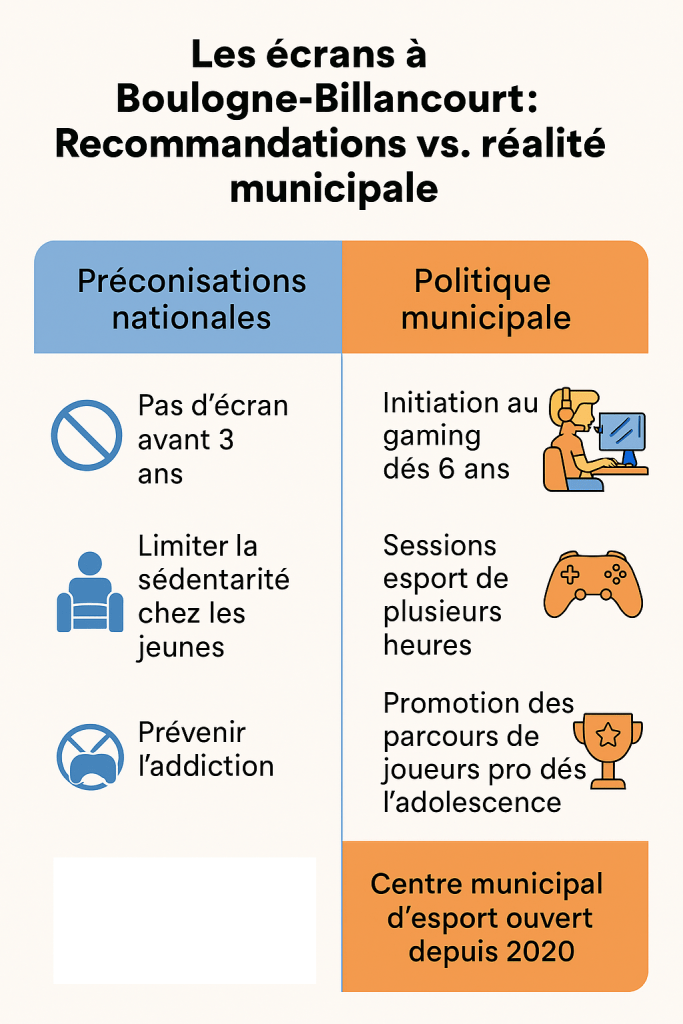 D’un côté, l’État et les pédiatres tirent la sonnette d’alarme : les écrans nuisent au développement des enfants. De l’autre, Boulogne-Billancourt se vante d’avoir le tout premier centre municipal d’esport d’Europe, accessible… dès 6 ans. Une schizophrénie municipale qui brouille les messages, et laisse les parents, comme les enfants, les yeux rivés sur une politique à double écran.