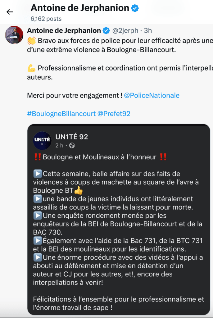Antoine De Jerphanion, élu d’opposition municipale (Horizons), a été un des premiers à réagir sur X (anciennement Twitter), préférant retenir l’efficacité et professionnalisme des forces de l’ordre locale.